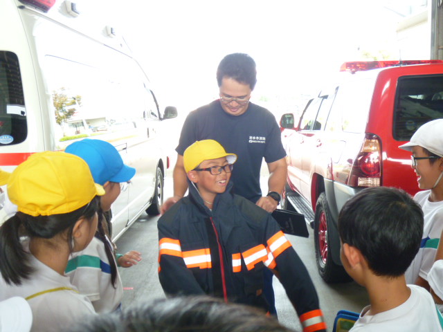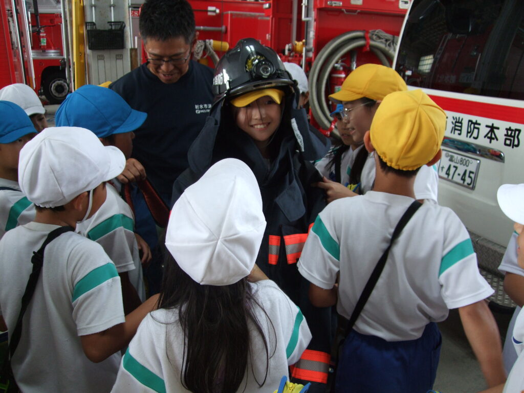 射水消防署では、消防署での仕事の内容を教えていただいたり、実際に防具や消防車を見せていただいたりしました。通報が入った際に、位置情報が分かるシステムも実際に見せていただき、子供たちは目を輝かせていました。